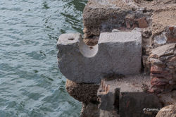 Ya en el interior nos encontramos con la presa, atravesada por nueve Cárcavos finamente tallados, podemos observar los goznes de la Compuerta Molinera, los saetines cada uno de ellos con unos surcos tallados en la piedra por donde corrían las compuertas que evitaban que el agua acumulada en la caldera durante la creciente, se escapara en la bajante.